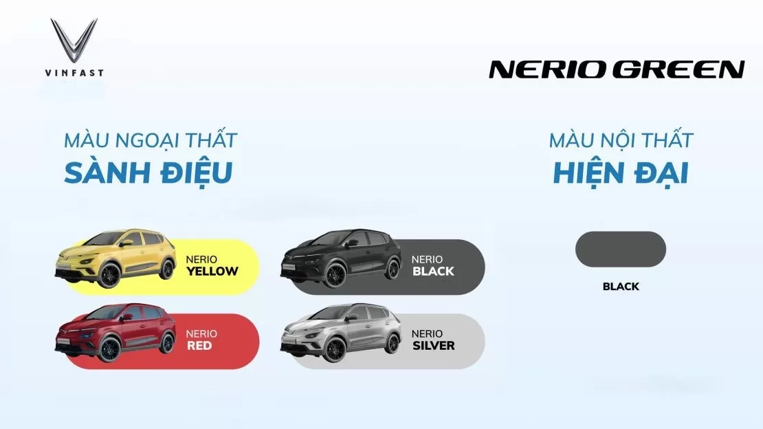 VinFats Nerio Green mở bán với 4 màu sắc tùy chọn ngoại thất thời thượng đáp ứng đa dạng sở thích của khách hàng từ cá nhân đến doanh nghiệp. Các màu sắc ngoại thất của Nerio Green gồm: Nerio Green màu đỏ, Nerio Green màu vàng, Nerio Green màu bạc, Nerio Green màu đen