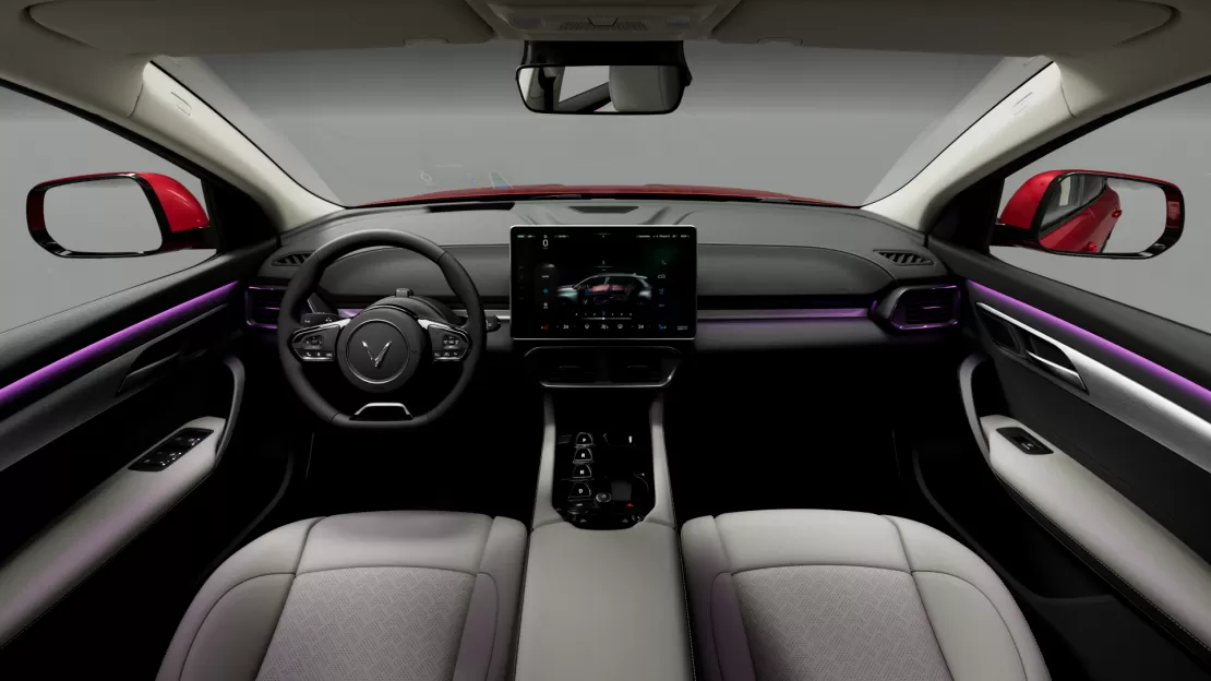 Điểm độc đáo của VF 8 phải kể đến không gian khoang lái với cụm vô lăng và bảng taplo hiện đại. Cụm đồng hồ thông tin lái được thay thế bằng màn hình HUD và tích hợp cùng với màn hình giải trí trung tâm kích thước 15,6 inch, đồng thời tối giản các nút bấm vật lý giúp người dùng dễ dàng theo dõi thông tinh hành trình và điều chỉnh các tính năng theo nhu cầu.