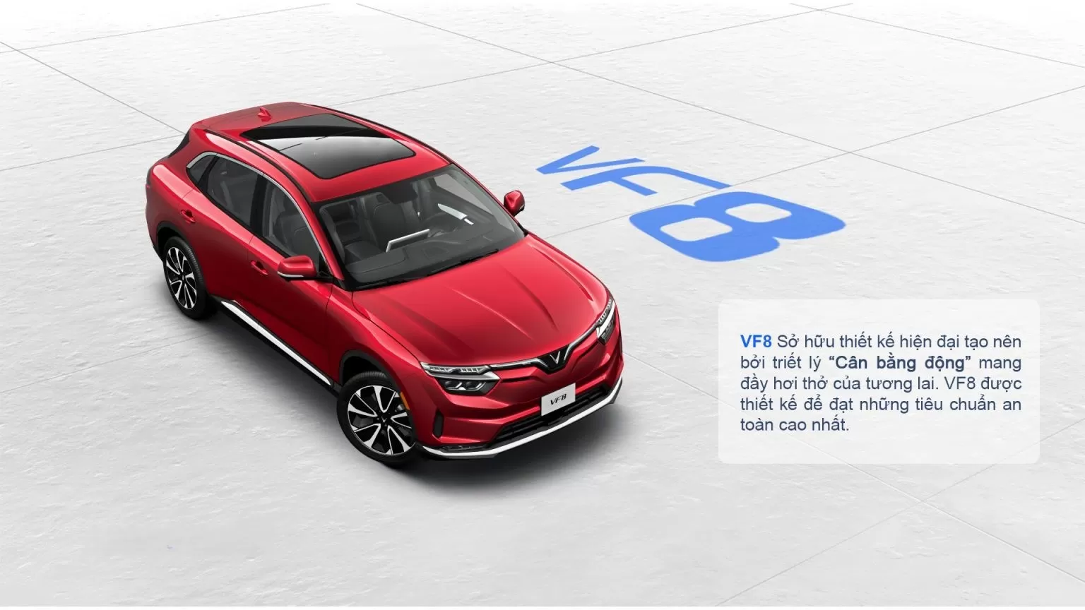 VinFast VF 8 là dòng xe SUV thuộc phân khúc D. Được tích hợp những tính năng hỗ trợ lái nâng cao (ADAS) như hỗ trợ giữ làn, giảm thiểu va chạm, giám sát người lái, tự động đỗ xe và triệu tập xe thông minh… Ngoài ra, xe VF 8 còn được trang bị các tính năng tiện ích giải trí thông minh như điều khiển xe bằng giọng nói, trợ lý ảo, kết nối các ứng dụng thương mại điện tử, dịch vụ… VF8 được giới thiệu tại thị trường Việt Nam với 2 phiên bản VF8 Eco và VF8 Plus.